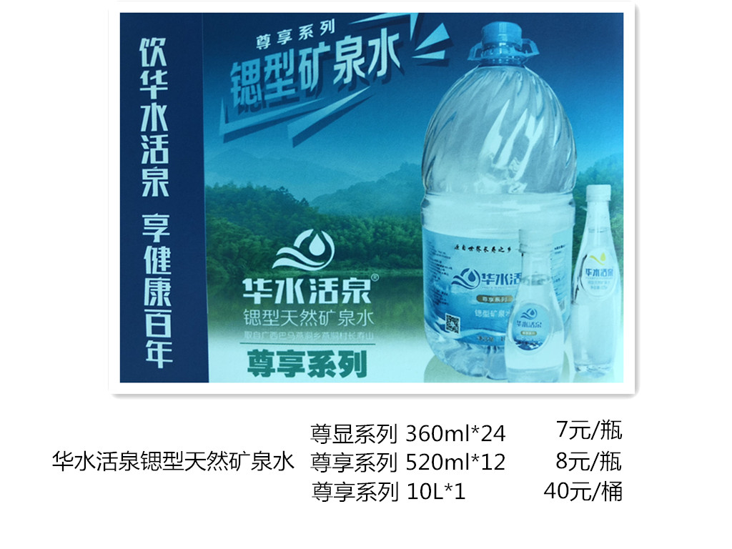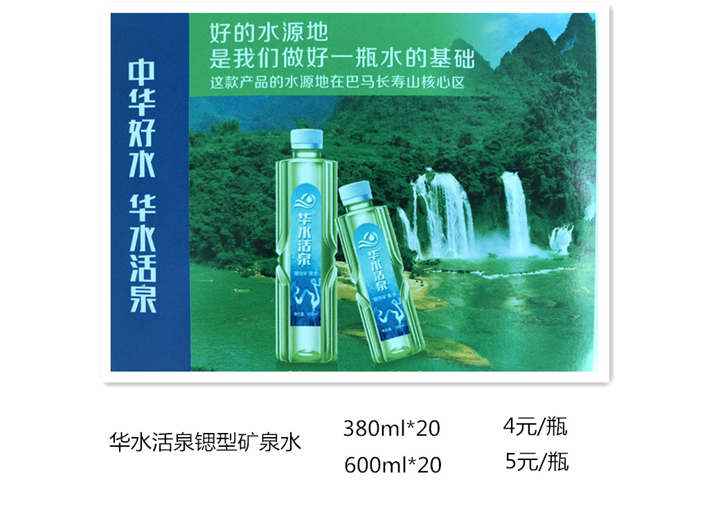 巴马华水活泉水源采自广西巴马瑶族自治县燕洞乡长寿山的天然自涌泉,2013年被国际食品安全协会授予“中国十大高端水源地饮用水”的荣誉。